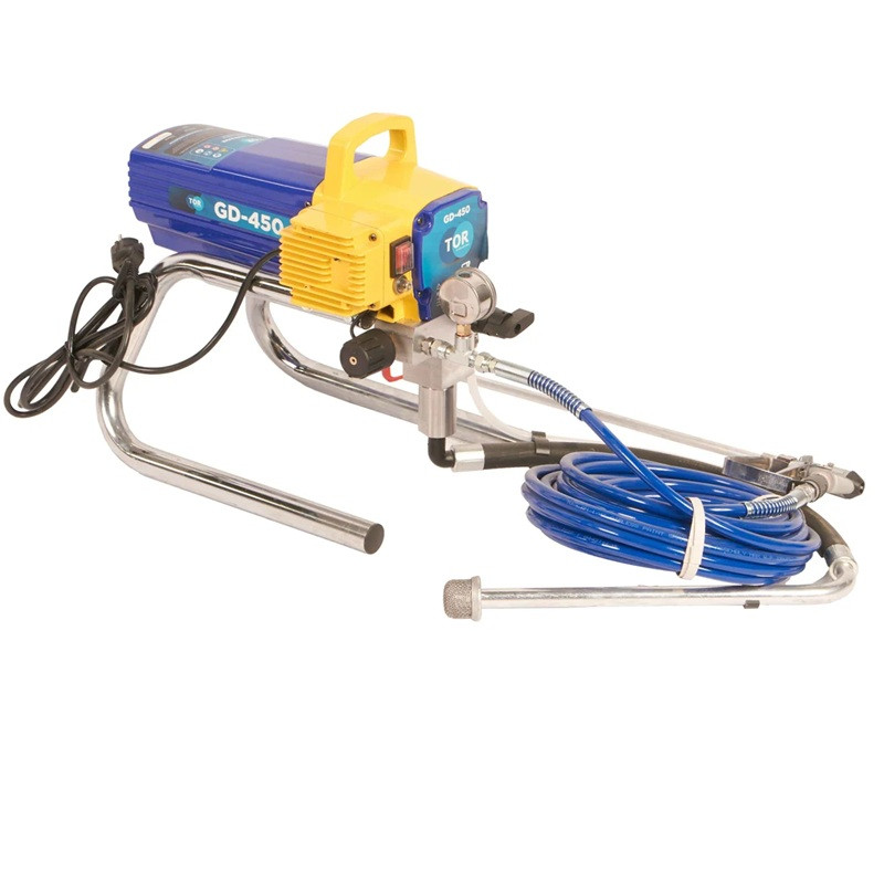 Аппарат окрасочный Tor GD-450 1033105 оборудование для окраски под высоким давлением через окрасочный краскопульт безвоздушного распыления. Окрасочный агрегат безвоздушного распыления предназначен для использования на строительных площадках и промышленных предприятиях. Он применяется для распыления под большим давлением красок и других материалов вязкостью до 60 DIN. Работает аппарат от стандартной сети 220В. Производительность при давлении 12 МПа составляет 1,7 литра в минуту, максимальное рабочее давление - 20 МПа.