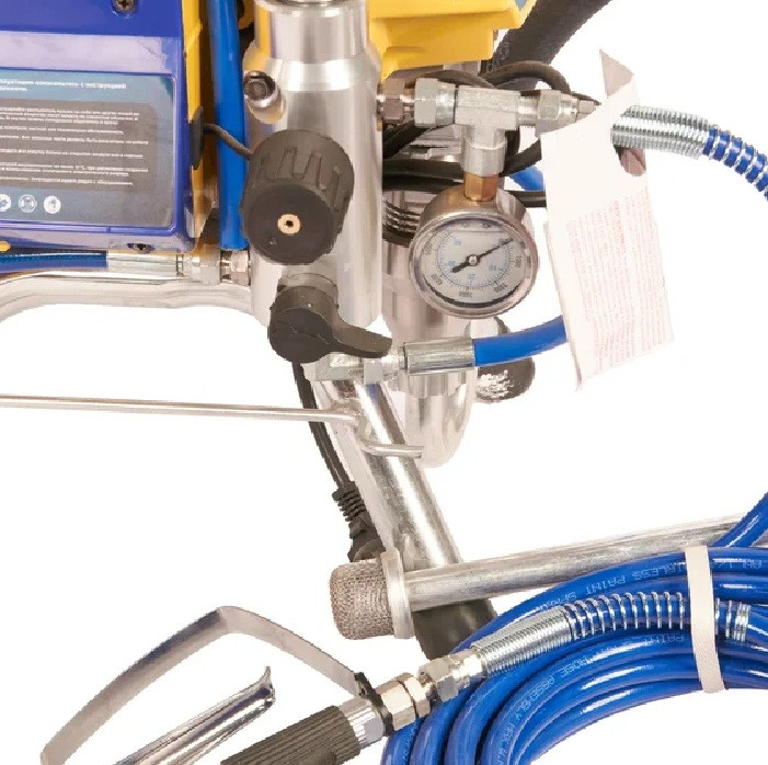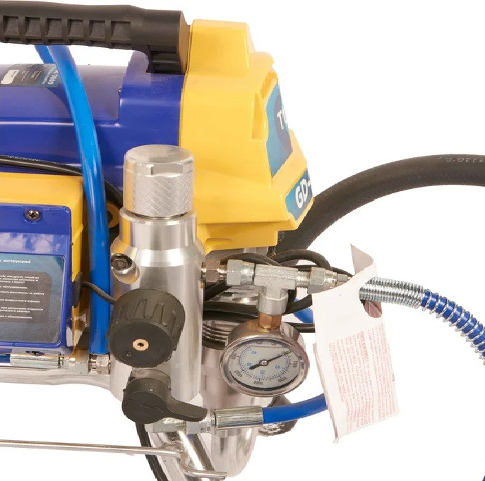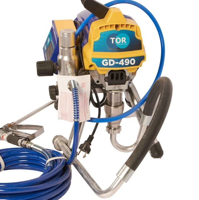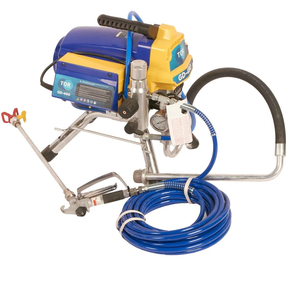 Аппарат окрасочный Tor GD-490 1033109 оборудование для окраски под высоким давлением через окрасочный краскопульт безвоздушного распыления. Окрасочный агрегат безвоздушного распыления предназначен для использования на строительных площадках и промышленных предприятиях. Он применяется для распыления под большим давлением красок и других материалов вязкостью до 60 DIN. Работает аппарат от стандартной сети 220В. Производительность при давлении 12 МПа составляет 2,1 литра в минуту, максимальное рабочее давление - 20 МПа.