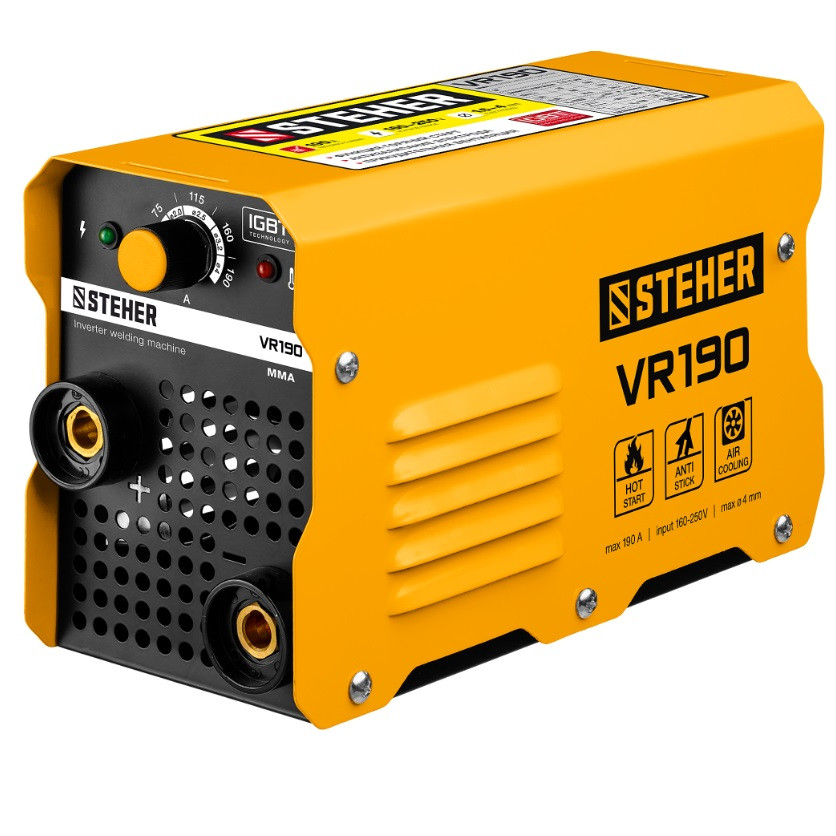 Аппарат сварочный инверторный Steher VR-190 ММА 190 А 4 мм обладает минимальным весом в серии. Это обеспечено небольшим инверторным блоком. Такой аппарат удобно использовать для небольших швов и кратковременных сварочных работ любой сложности.