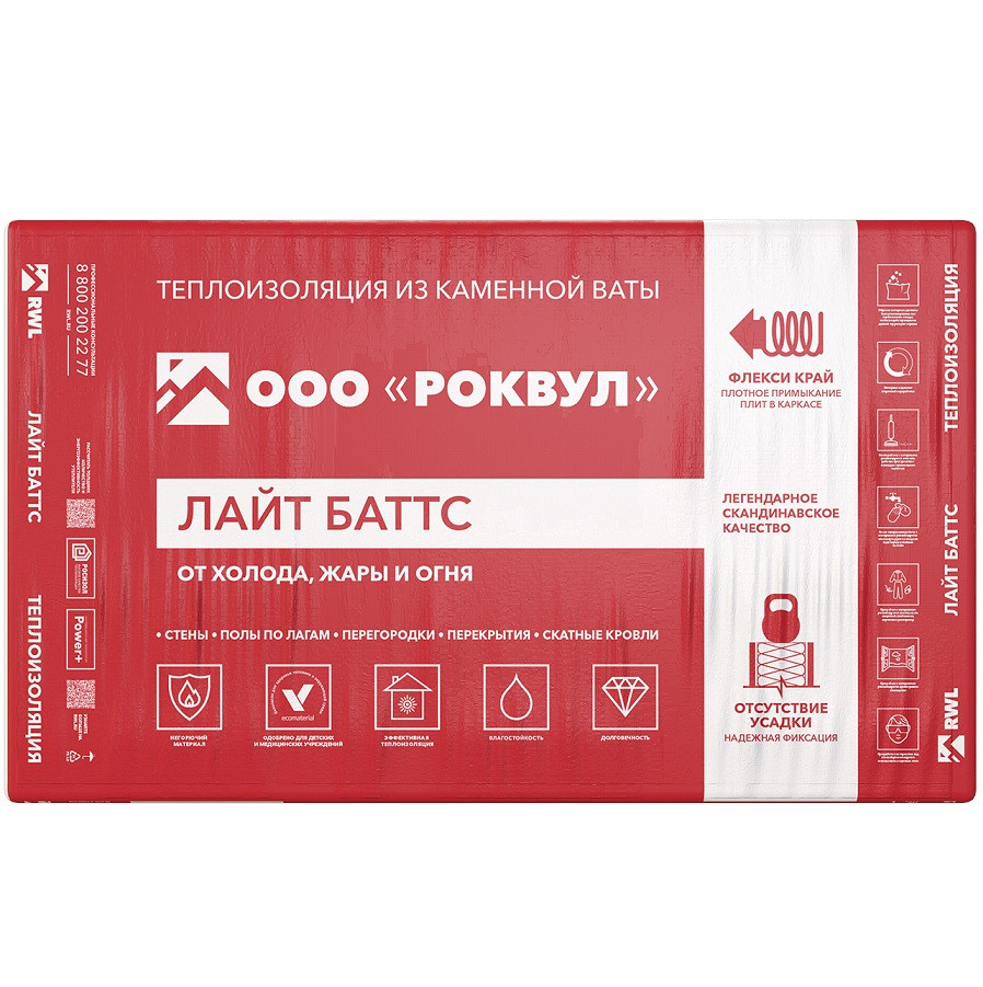 Базальтовая вата Роквул Лайт Баттс – лёгкие гидрофобизированные теплоизоляционные плиты, изготовленные из каменной ваты на основе базальтовых пород. Главной особенностью этих плит является использование уникальной технологии Флекси - один край плиты имеет способность поджиматься и разжиматься, т.е. пружинить, благодаря чему облегчается установка материала в конструкции на деревянном или металлическом каркасе. Этот край располагается с длинной стороны плиты (1000 мм), ширина самой кромки составляет 50 мм. Флексированный край промаркирован с торца плиты.