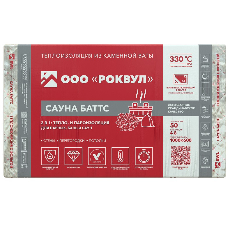 Плиты специально предназначены для теплоизоляции стен в парных. При монтаже не требуют устройства дополнительного слоя пароизоляции за счёт покрытия алюминиевой фольгой, которая так же обладает теплоотражающими свойствами. Данный материал обладает высокой пожарной безопасностью и имеет природное происхождение.