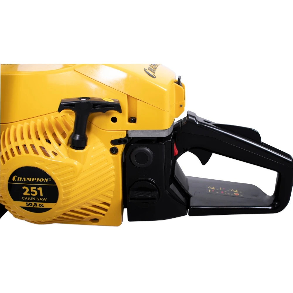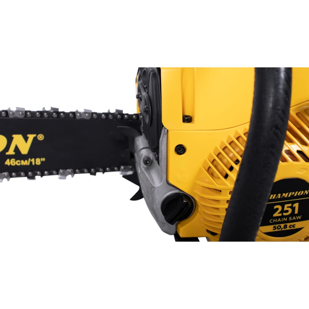 У цепи пилы профессиональный шаг 0,325 дюйма под широкий паз 1,5 мм. Бензопила Champion 251-18 оборудована подогревом карбюратора, позволяющим эксплуатацию при отрицательных температурах. В основании пильной шины есть стальной зубчатый упор, упрощающий распиловку бревен больших диаметров. Подача смазывающего масла на шину и цепь производиться автоматически посредством металлического насоса. Двигатель бензопилы работает на смеси двухтактного масла с бензином в пропорции 1 к 50. Бензопила оборудована системой виброгашения и всеми необходимыми системами безопасности, такими как центробежный тормоз цепи и цепеуловитель.
