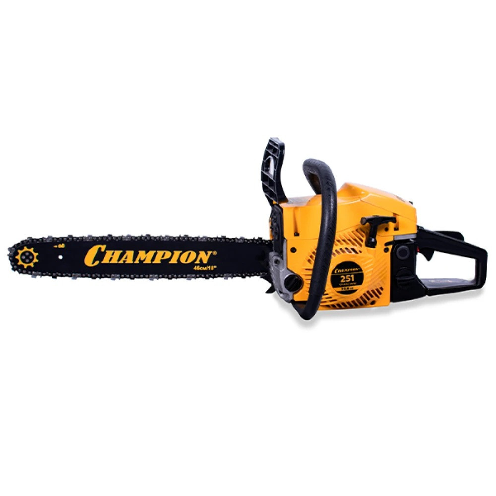 Бензопила Champion 251-18 – мощная бензиновая модель позиционируемая производителем как профессиональная. Мощность двухтактного мотора пилы составляет 3,13 лошадиные силы, а длинна полотна достигает 45 см. Натяжение цепи боковое, сама шина имеет четыре точки крепления ведомой звездочки. Стартер у пилы ручной с системой легкого запуска, упрощающей продергивание шнура кик стартера на 30%.