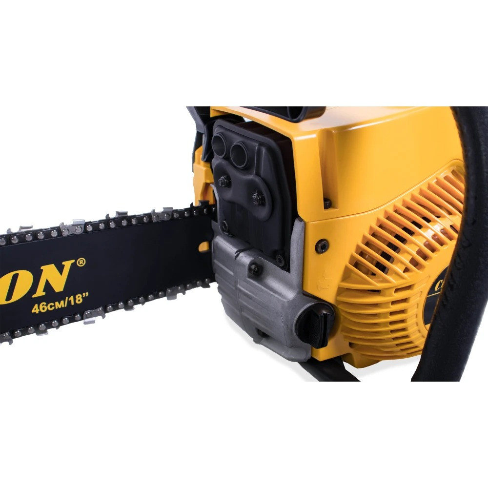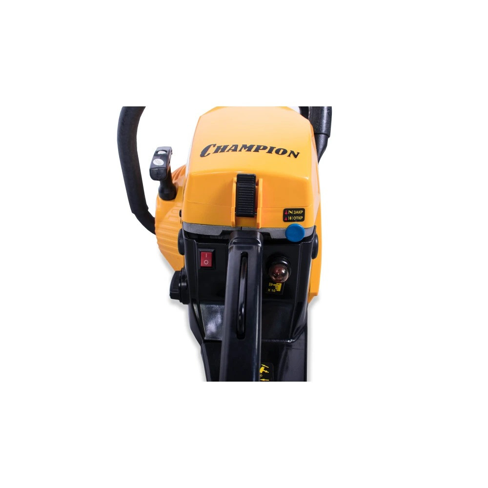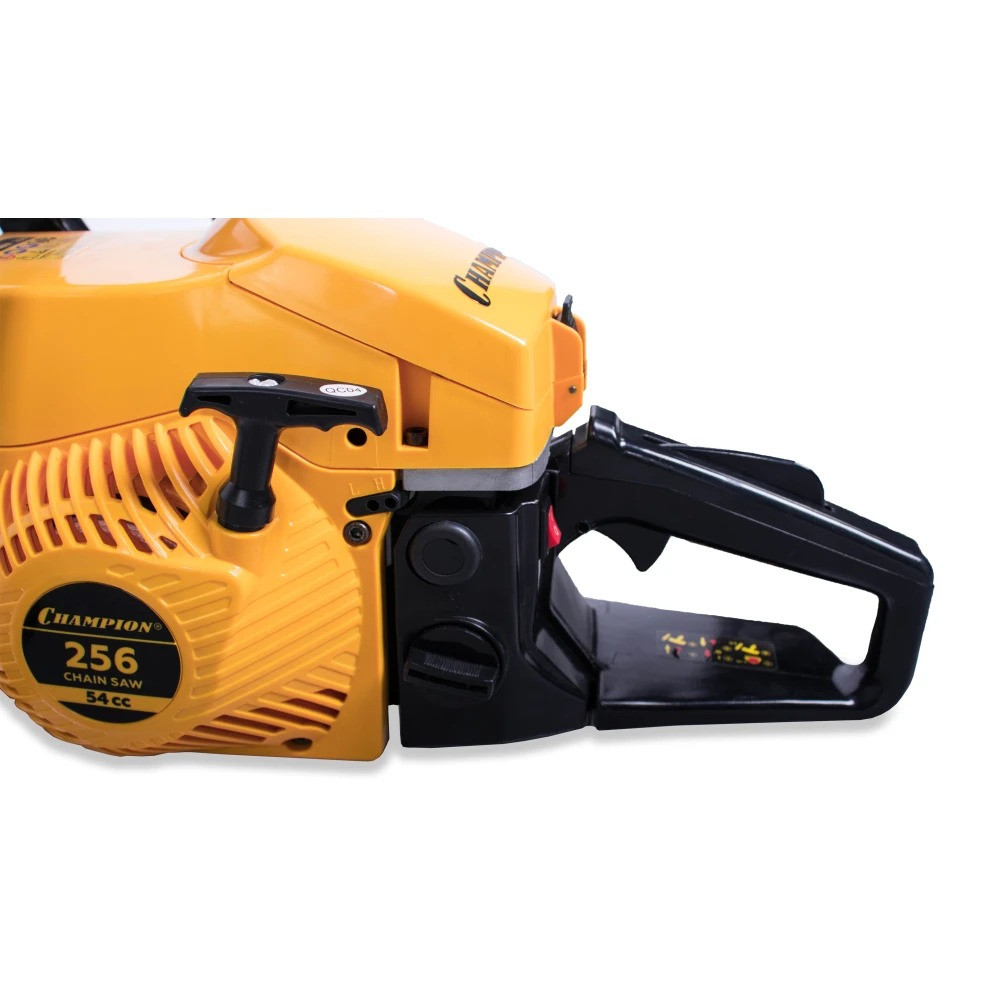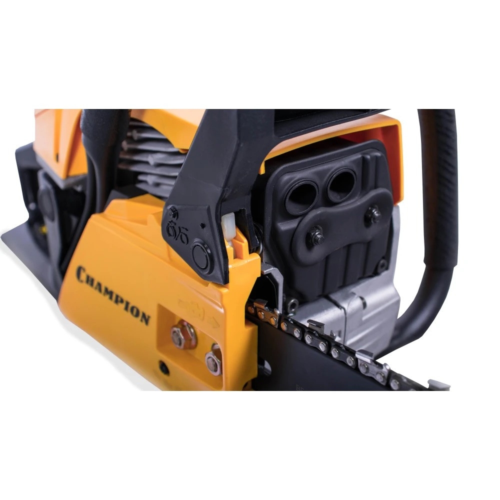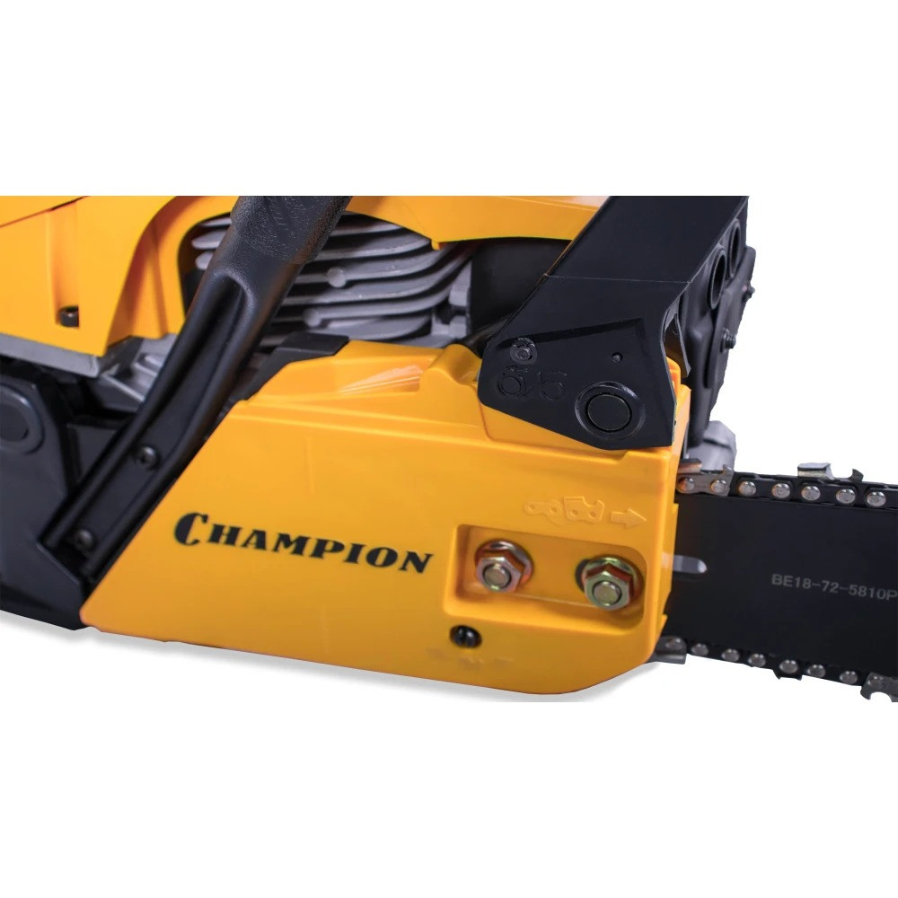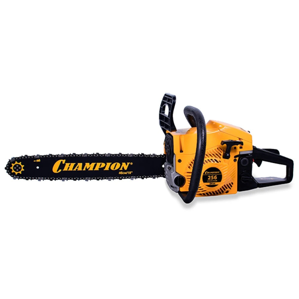 Длина пильного полотна составляет 45 см, что позволяет валить деревья большого диаметра. Пильное полотно имеет ширину паза 1,5 мм, а его ведомая звездочка крепиться на четырех клепках. Бензопила Champion 256-18 оборудована надежным диафрагменным карбюратором, обеспечивающим уверенный запуск даже при отрицательных температурах. Для работы зимой у пилы предусмотрен подогрев карбюратора за счет направления на него горячих выхлопных газов.