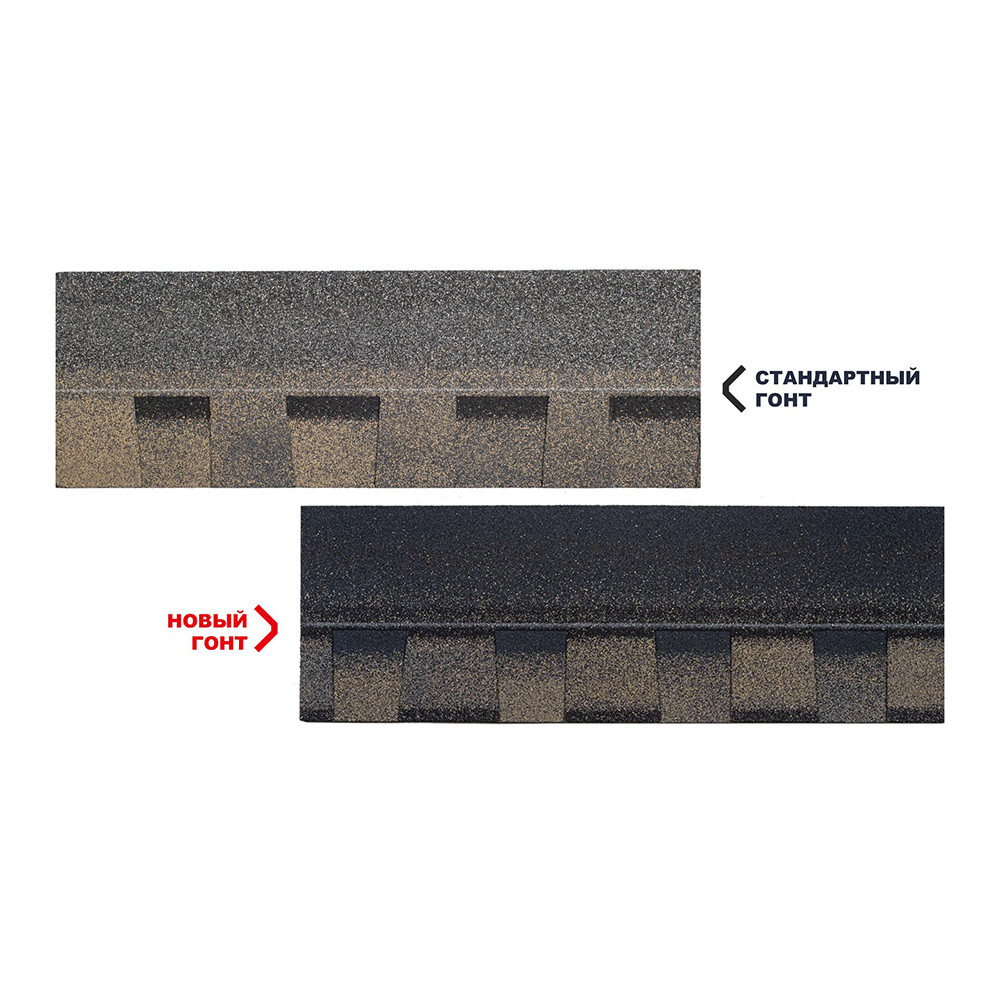 - Кровля с высокой степенью реалистичности объема и глубины. Благодаря двойному нанесению тени сверху и снизу видимой части гонта. обеспечивается постоянный трехмерный эффект, который не зависит от угла падения солнечных лучей на кровлю.