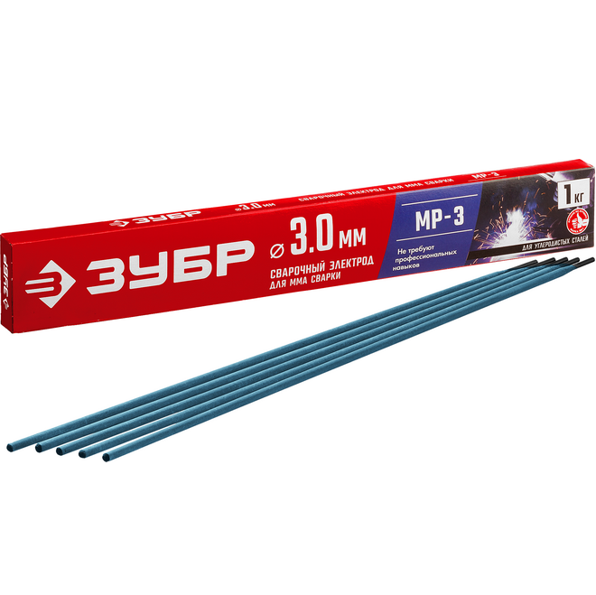 Электроды с рутиловым покрытием Зубр МР-3 имеют качественное рутиловое покрытие стержня, позволяющее вести сварку ответственных металлических конструкций во всех пространственных положениях. Обладают легким первичным и последующим розжигом сварочной дуги. Допускают сварку ржавого, влажного и плохо очищенного металла. Применяются для сварки углеродистых сталей на ММА инверторах при переменных или постоянных токах обратной полярности. Предел прочности 480 Мпа.