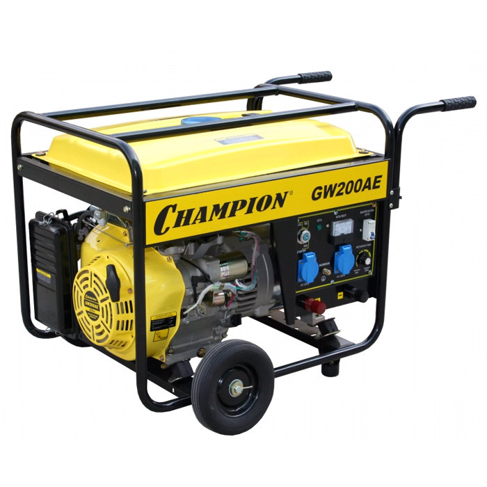Генератор бензиновый Champion GW200AE сварочный бытовой агрегат, который используется не только в качестве альтернативного источника питания электроприборов, но и в качестве сварочного аппарата. Благодаря вместительному топливному баку в сумме с экономичным двигателем, станция может проработать свыше 20 часов на одной заправке под нагрузкой не более 70%. Для работы двигателя рекомендуется этилированный бензин с октановым числом не ниже 92. Категорически нельзя использовать старый загрязнённый бензин или смесь бензин-масло.