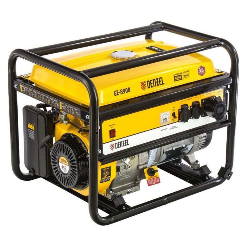 Бензиновый генератор GE 8900 Denzel с мощностью 8,5 кВт, выходным напряжением 220 В/50 Гц и объемом топливного бака 25 литров. Одна из мощных электростанций резервного типа, но при этом экономичная и компактная. Подходит для коммерческих целей и бытового использования. Генератор может запитать электричеством небольшую торговую точку, стройплощадку, кемпинг. 25-литрового бака хватит на 7-8 часов работы. Оснащается ручным стартером.