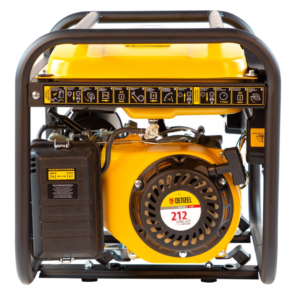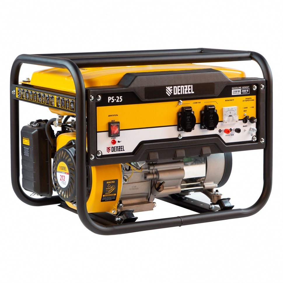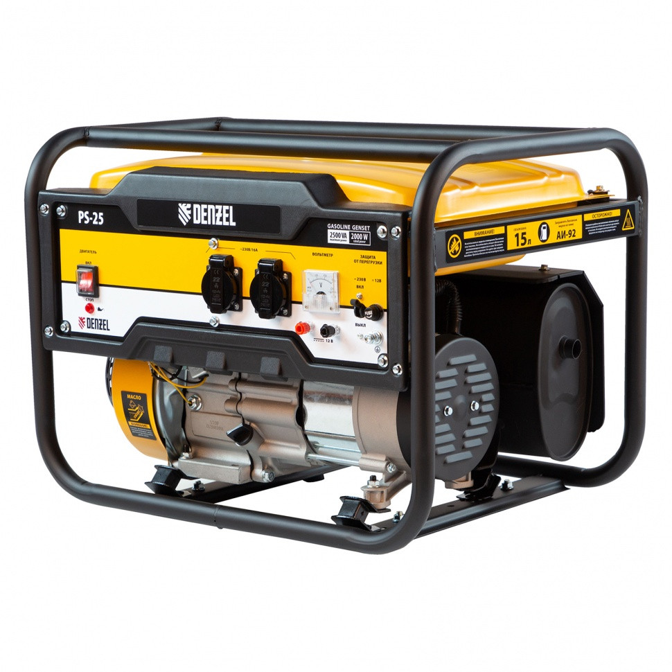 Бензиновый генератор PS 25 Denzel, мощностью 2,5 кВт, объем бака 15 литров, выдает напряжение 230 В. Простой, достаточно мощный генератор для бытового использования. Подойдет для дачи, загородного домика, используется на рыбалке и в торговом павильоне. Через генератор можно запитать инструменты, маломощные приборы ; телевизор, холодильник, лампы освещения и т.д.