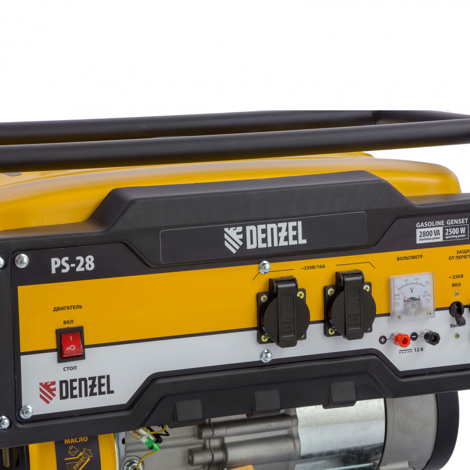 Генератор бензиновый PS 28 Denzel мощностью 2,8 кВт, объемом топливного бака 15 литров, выходное напряжение 230 Вольт. Экономичный источник питания для дачи, гостевого домика, палаточного лагеря, домашней мастерской. Можно одновременно запитать ламы освещения и маломощные приборы/инструменты. Объем бензобака обеспечивает длительную работу – до 12 часов на одной заправке.
