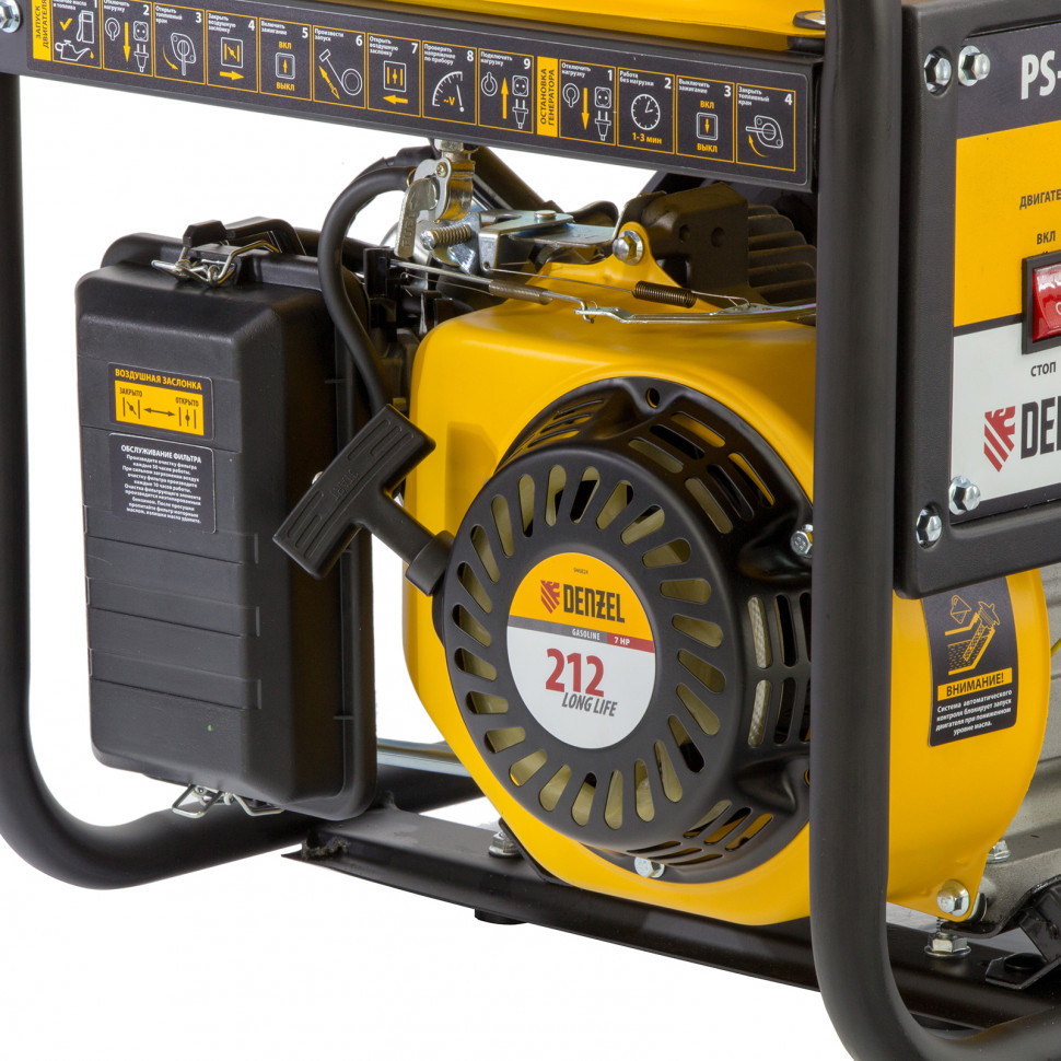- бензиновый генератор Denzel имеет низкий уровень шума – до 85 дБ, встроенные розетки – 2 штуки, ручной стартер.