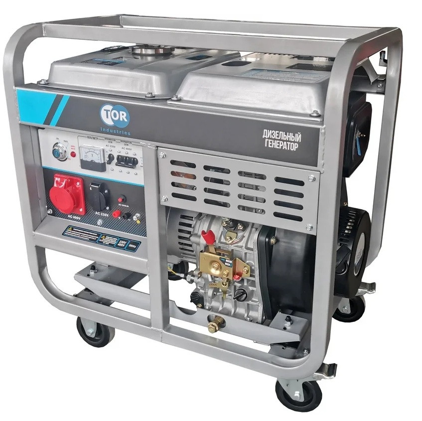 Генератор дизельный Tor KM5000D 1025964 5 кВт 380В/1,6кВт 220В 15 л рассчитан на питания оборудование суммарной мощностью 5кВт (380В) или 1,7 кВт (220В). Оборудован электростартером, топливным баком 15л. Модель выполнена на жесткой металлической раме высокой прочности. Наличие колес позволяет без труда перемещать генератор по рабочей площадке.