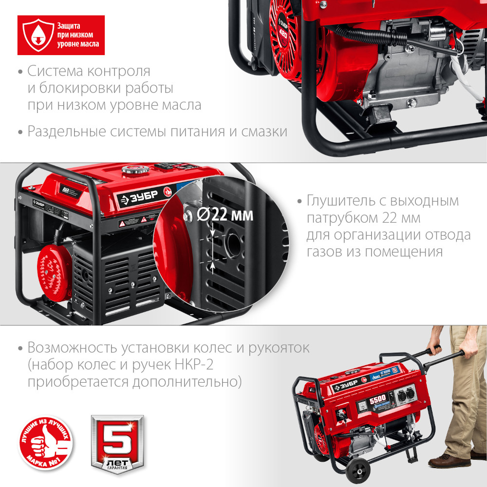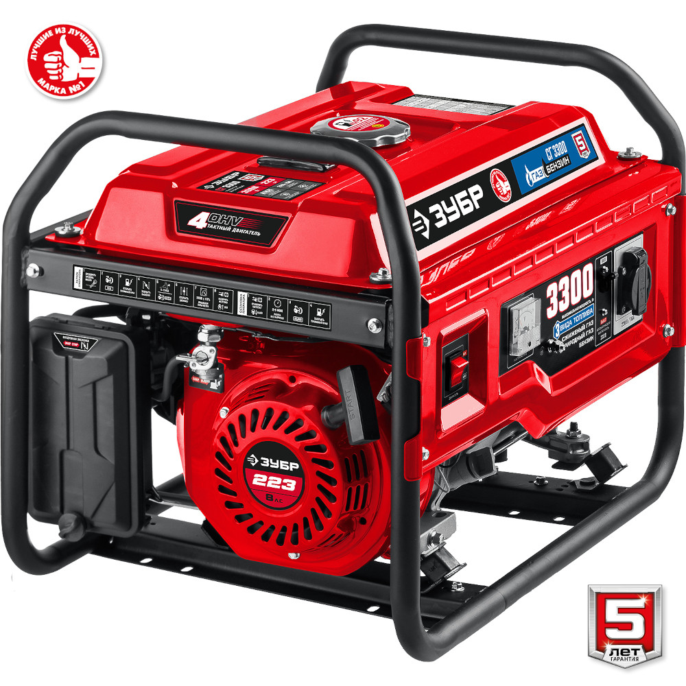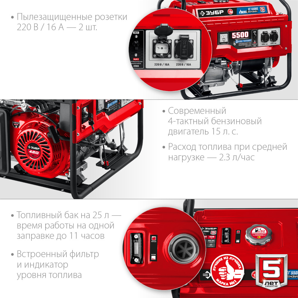 Мощный двухтопливный электрогенератор Зубр мощностью 5,5 кВт, работающих как на бензине (АИ-92), так и на газе – при этом, для использования газа не требуется установка дополнительного оборудования. Генератор этой модели используется в загородном доме, строительной площадке и дачном участке для питания бытовой техники, насосных станций и электронагревателей. Аккумуляторная батарея не входит в комплект поставки. Емкость батареи не менее 14 А*ч.