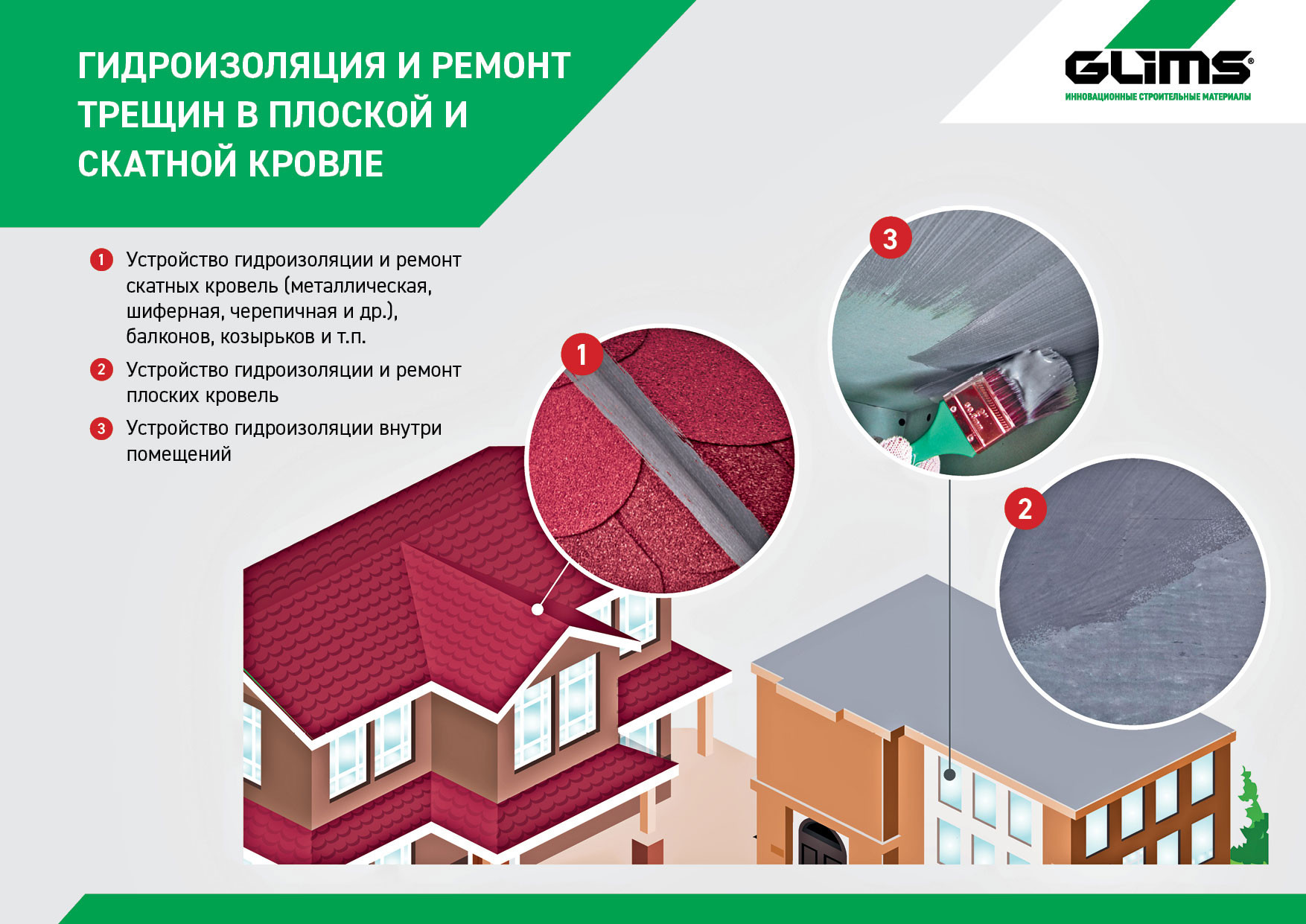 Гидроизоляция Glims GreyResin – однокомпонентная полимерная композиция на водной основе для устройства гидроизоляции и ремонта трещин в плоской и скатной кровле; обработки межпанельных швов и защиты монтажной пены от климатических воздействий и УФ-излучения при установке окон; для устройства гидроизоляции при внутренних и наружных работах. Может применяться в качестве финишного покрытия.