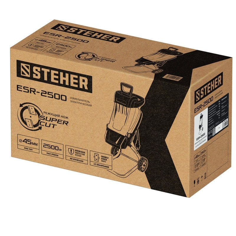 Измельчитель садовый электрический Steher ESR-2500 2500 Вт - прекрасный помощник для измельчения отходов растительного происхождения. Ветки, сучки, остатки корней теперь не будут бесполезным мусором на участке, а послужат отличным удобрением для грядок. Мощный двигатель с большим крутящим моментом, оснащенный редуктором. Режущие ножи из закаленной стали с двухсторонней заточкой обеспечивают отличную режущую способность с сохранением режущих свойств и длительное использование благодаря возможности перестановки. Колеса большого диаметра увеличивают мобильность и облегчают эксплуатацию изделия.