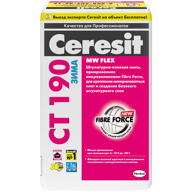 Смесь Ceresit CT 190 Зима предназначена для приклеивания минераловатных плит и устройства защитного армированного слоя при утеплении фасадов зданий и сооружений, не отапливаемых в период выполнения работ. Ceresit CT 190 Зима является составной частью системы утепления наружных стен зданий Ceresit на базе минераловатных плит. Применяется при утеплении стен по кирпичным, бетонным, оштукатуренным и другим минеральным поверхностям новых зданий, а также зданий, находящихся в эксплуатации.