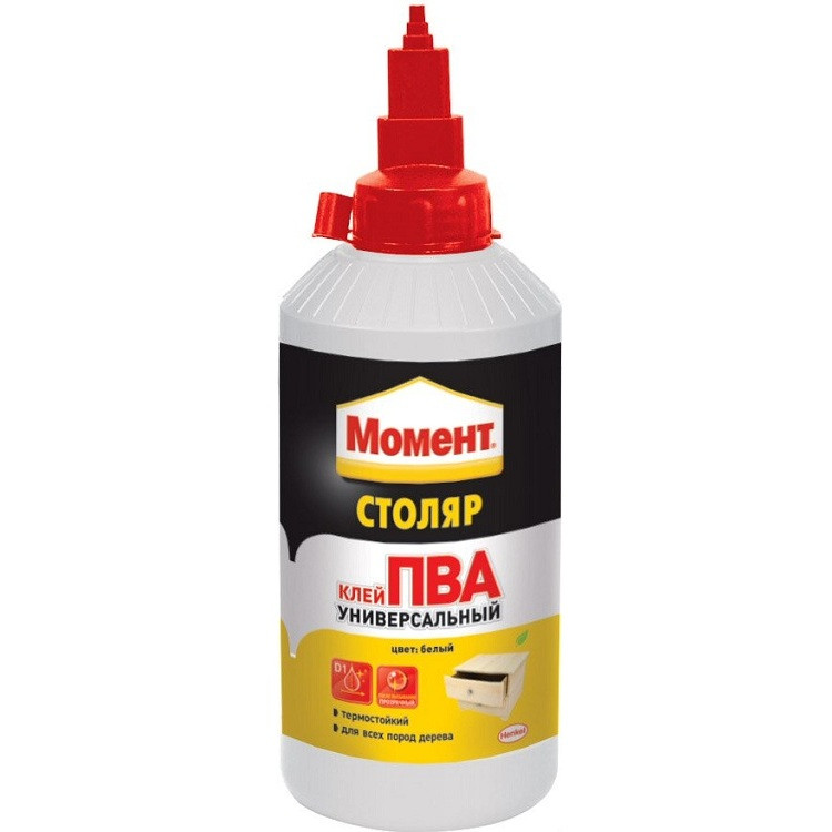 Клей Момент Столяр представляет собой универсальный клей на основе водной дисперсии ПВА, предназначенный для всех пород дерева. Подходит для монтажного склеивания всех пород дерева, ДСП, ДВП, МДФ, многослойной фанеры, приклеивание декоративного бумажно-слоистого пластика и шпона.