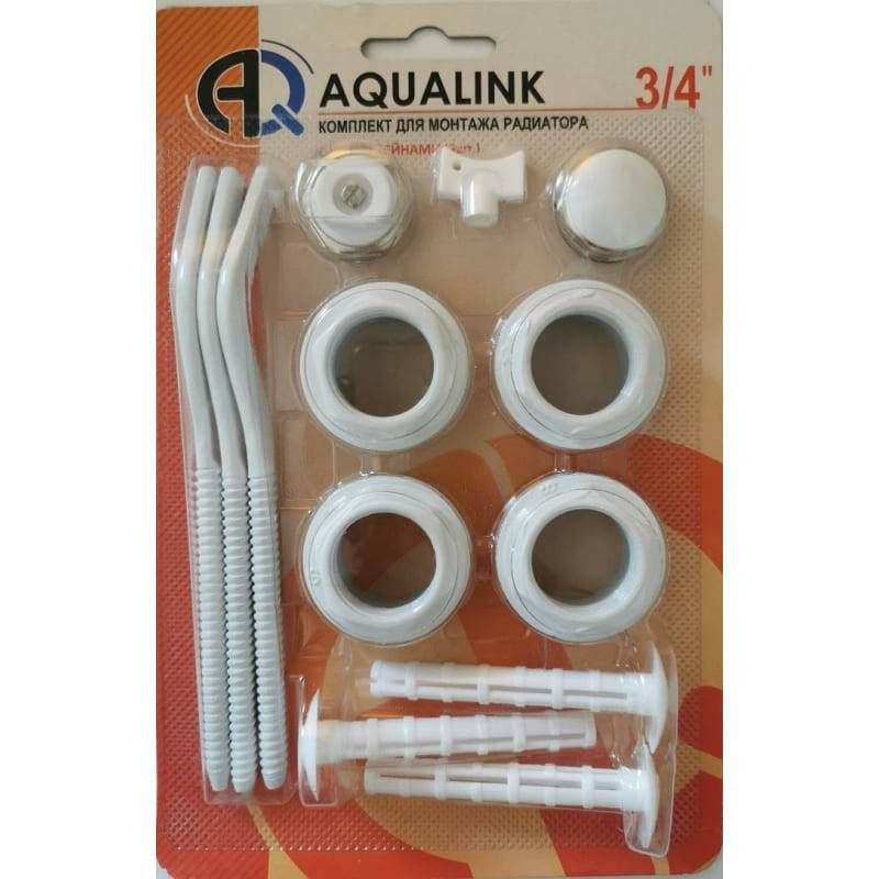 Комплект для монтажа радиатора Aqualink 04601 3/4 дюйма 13 предметов - предназначен для установки алюминиевых и биметаллических секционных радиаторов. Применяется в системах водяного отопления. В комплект входит: переходник с левой резьбой и силиконовой прокладкой - 2 штуки, переходник с правой резьбой и силиконовой прокладкой - 2 штуки, воздухоотводчик ручной (кран Маевского), ключ для спуска воздуха, заглушка на переходник, кронштейн штыревой плоский - 3 штуки, дюбель - 3 штуки.