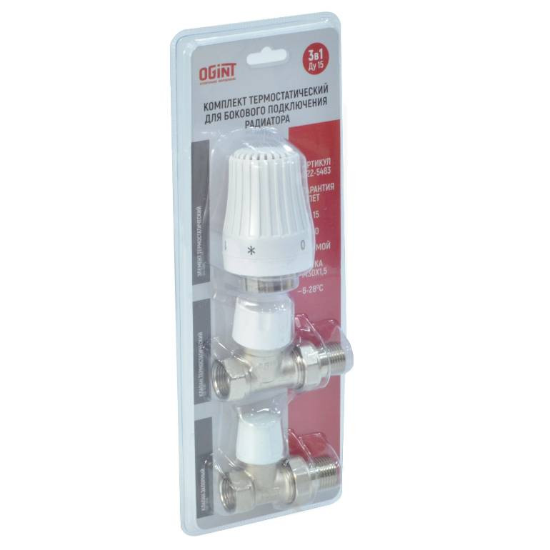Комплект термостатический для радиатора Ogint 022-5483 прямой Ду 15 Ру 10 М30х1,5 - комплект 3 в 1 для бокового подключения предназначен для ручного или автоматического регулирования расхода теплоносителя через радиаторы двухтрубных систем отопления. Клапаны рассчитаны для работы с теплоносителем с температурой до 120 °С и давлением до 1,0 Мпа. В качестве рабочей среды, помимо воды могут использоваться растворы этиленгликоля и пропиленгликоля (до 50%), а так же другие жидкости, нейтральные по отношению к материалам клапанов. Прямой и угловой клапаны отличаются впускными и выпускными патрубками, которые могут располагаться прямолинейно или под углом. Может подключатся к системам на 1/2 или на 3/4 дюйма.