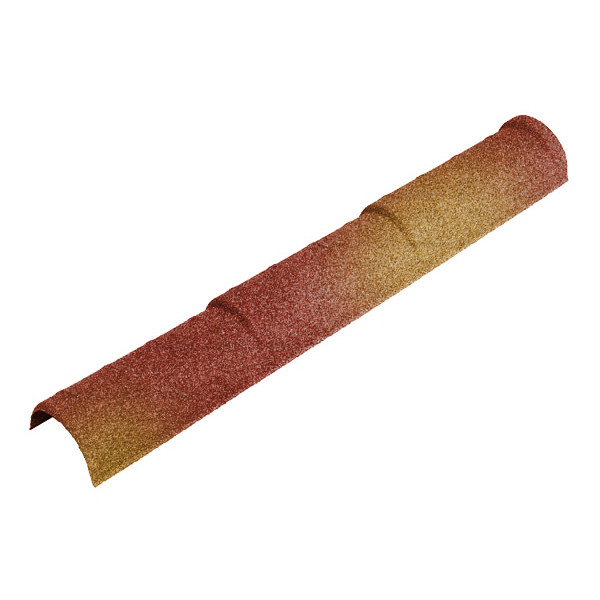Конек полукруглый тройной Metrotile красно-желтый - доборный элемент, который применяется для скатных кровель. Является важной составляющей крыши Metrotile. Позволяет красиво оформить верхнюю часть кровли и придать конструкции эстетически завершённый вид. Вместе с этим он обеспечивает циркуляцию воздуха в подкрышном пространстве и принимает на себя основную нагрузку от неблагоприятных внешних факторов.