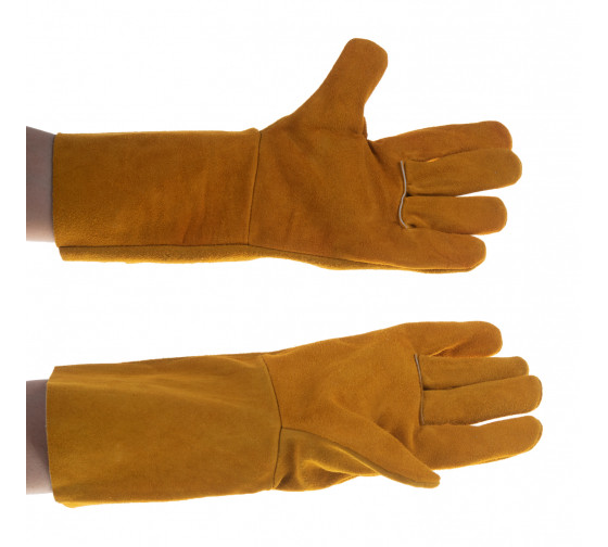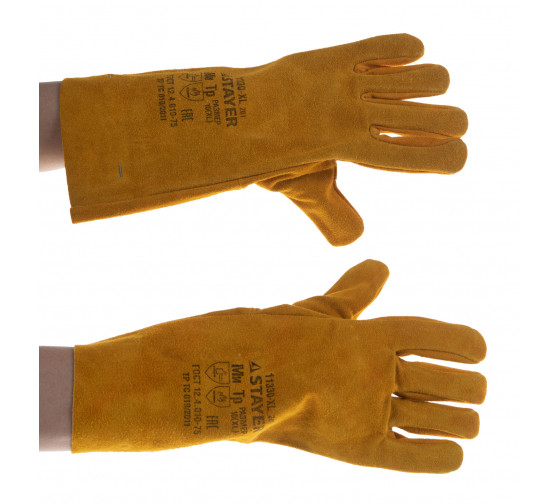 Перчатки Stayer изготовлены из искусственной кожи высокого качества и рассчитаны на многоразовое использование. Длина изделия составляет 400 мм. Перчатки, имеющие хорошо заметный издали желтый цвет, соответствуют размеру XL.