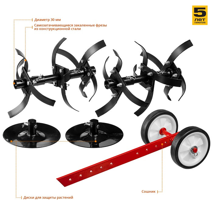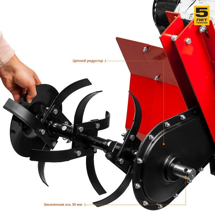 Защитный кожух агрегата ограничивает доступ к вращающимся частям клиноременной передачи и обеспечивает безопасность. Регулируемый сошник надежно фиксируется к раме культиватора и отвечает за регулировку глубины вспашки. Закаленные фрезы прекрасно закапываются на полную глубину и способствуют продвижению культиватора вперед. Боковые диски защищают ваши посадки от вращающихся ножей культиватора.