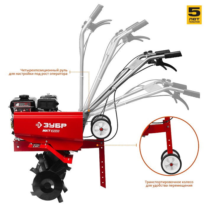 Мощный бензиновый культиватор Зубр МКТ-200 предназначен для рыхления и культивирования почвы, а при использовании дополнительного навесного оборудования спектр применения культиватора значительно расширится. Модель предлагает отличное сочетание высокой производительности, управляемости и устойчивости. Рукоять культиватора с возможностью регулировки по вертикали делает управление более комфортным. Сошник объединен с транспортировочными колесами для удобства перемещения до места работы не повреждая при этом газон или тротуарную плитку ножами.