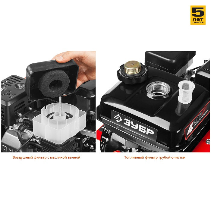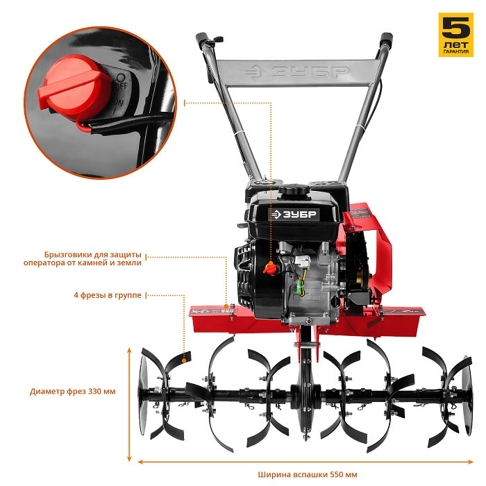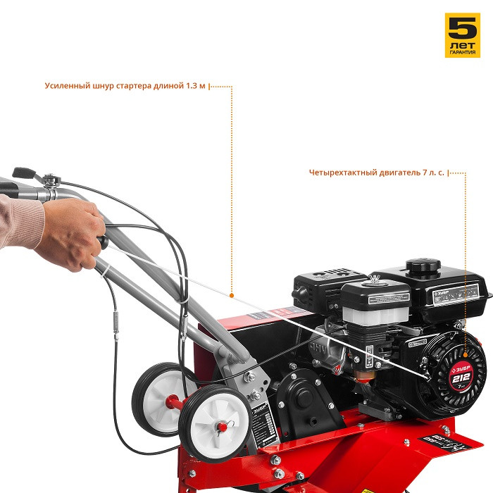 На корпусе культиватора Зубр МКТ-200 предусмотрен щиток, защищающий оператора от попадания земли. Ременное сцепление способствует ровному передвижению без рывков. Cамозатачивающиеся закаленные фрезы изготовлены из конструкционной стали.
