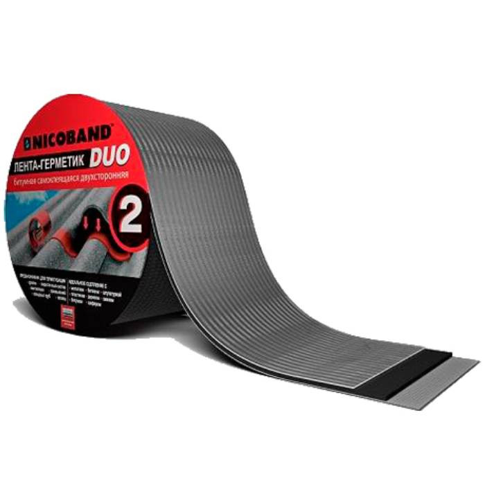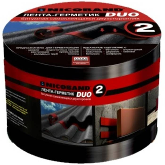 Двухсторонняя самоклеящаяся лента-герметик Nicoband Duo обеспечивает прочную приклейку к различным поверхностям: метал, шифер, дерево, пластмасса, штукатурка, стекло и др. что позволяет соединять и герметизировать различные по фактуре и свойствам элементы. Лента-герметик проста в применении и не требует дополнительных инструментов. При этом битумно-полимерное вяжущее ленты выполняет функции надежной герметичной прослойки, позволяя достичь абсолютной водонепроницаемости в месте стыка.