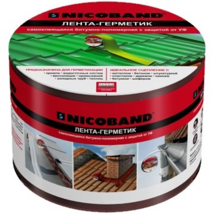 - Простота применения. Лента-герметик Nicoband в применении очень проста и не требует специальных навыков. Благодаря слою битумно-полимерного вяжущего специального состава великолепно выполняет функции герметизации на протяжении всего срока службы (10 лет).