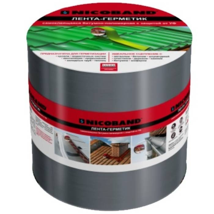 - Простота применения. Лента-герметик Nicoband в применении очень проста и не требует специальных навыков. Благодаря слою битумно-полимерного вяжущего специального состава великолепно выполняет функции герметизации на протяжении всего срока службы (10 лет).