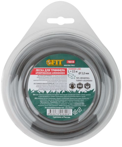 Леска для садовых триммеров Fit 78038 армированная алюминием, сечение звезда. Изготовлена из нейлона, в состав лески добавлен порошкообразный алюминий, за счет чего леска имеет повышенную прочность и износостойкость.