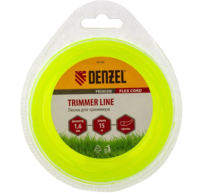 Леска для триммера Denzel Flex Cord диаметром 1,6 мм и длиной 15 м поставляется в блистере и предназначена для скашивания газонной или молодой травы. Она используется на электротриммерах малой мощности от 300 до 600 Вт.