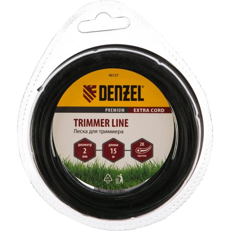Леска для триммера Denzel Extra Cord подходит к бензиновым триммерам высокой мощности. Имеет круглое сечение и ширину 2 мм, поэтому подходит для покоса как молодой, так и сухой травы, молодой поросли малины и других кустарников, бурьяна.;Леска изготовлена из двух частей — высокопрочной сердцевины и пластичной внешней оболочки. Такое решение повышает рабочий ресурс режущего материала до 40 % по сравнению с традиционными лесками.