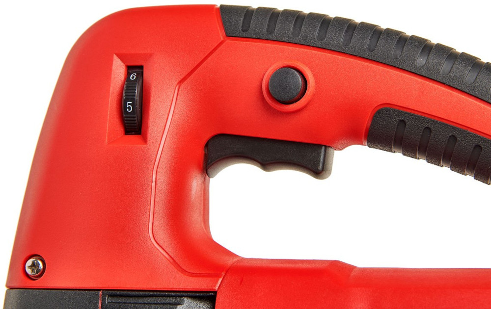 Частота хода пилки плавно регулируется нажатием на электронный выключатель. Дополнительно имеется колесико ограничения максимальной частоты хода пилки. Частоту хода пилки можно менять в широком диапазоне 800-3000 ходов в минуту. Дополнительно имеется фиксатор выключателя, позволяющий работать включенным инструментом без необходимости поддерживать давление пальцем на выключатель.