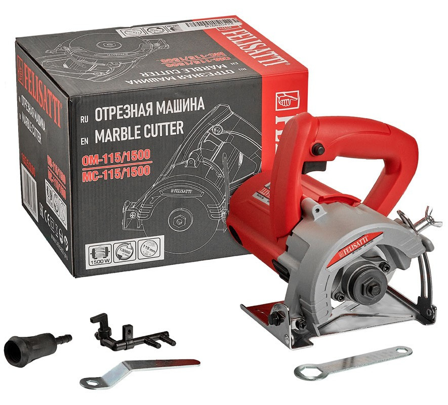 Отрезная машина Felisatti ОМ-115/1500 предназначена для сухой резки различных отделочных материалов – керамической плитки, керамогранита, облицовочной плитки из натурального камня – мрамора, гранита, песчаника и других декоративных видов камня, тротуарной плитки, черепицы и прочих материалов, нарезки канавок для улучшения адгезии строительных растворов.