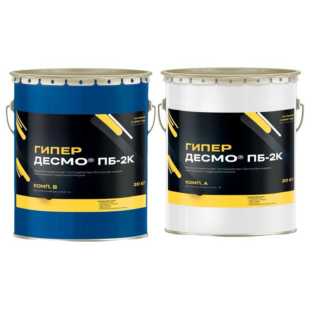 Мастика двухкомпонентная Гипердесмо ПБ-2К - двухкомпонентный материал на основе эластичных гидрофобных полиуретановых смол, смешанных с чистым битумом. После смешивания компонентов и нанесения полимеризуется, образуя бесшовное прочное гидроизоляционное покрытие с исключительно высокой эластичностью (>1600%).