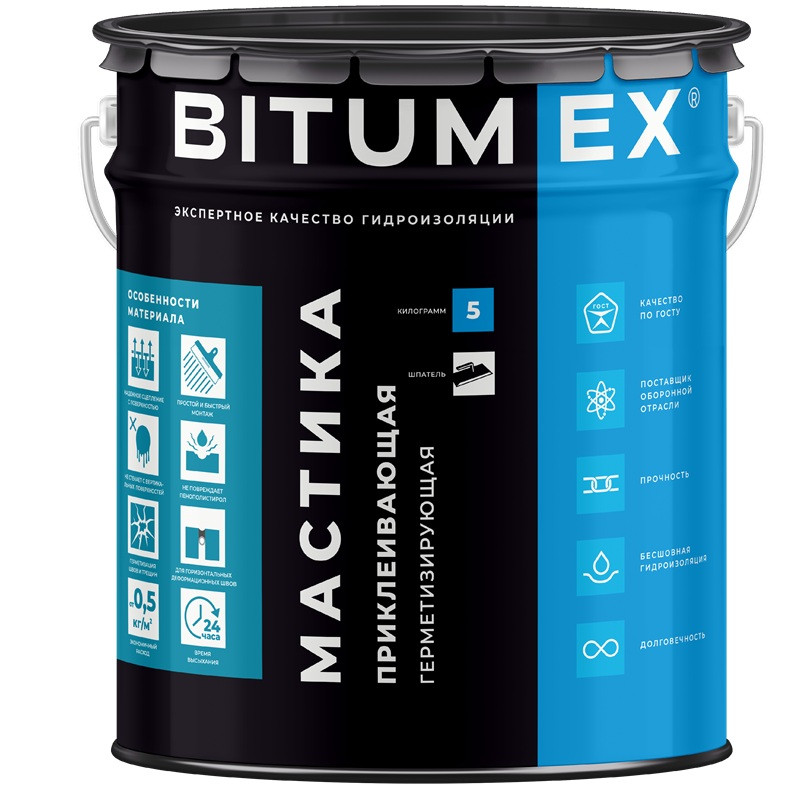 Мастика герметизирующая Bitumex МБП-011 битумная приклеивающая 5 кг представляет собой полностью готовый к применению материал на основе высококачественного строительного битума, содержащий технологические добавки и нейтральный органический растворитель. Мастика приклеивающая и герметизирующая прошла экспертизу Федеральной службы по надзору в сфере защиты прав потребителей и благополучия человека. Мастика произведена согласно ГОСТ 30693-2000. Сертификат соответствия № РОСС RU.HB61.Н23104.
