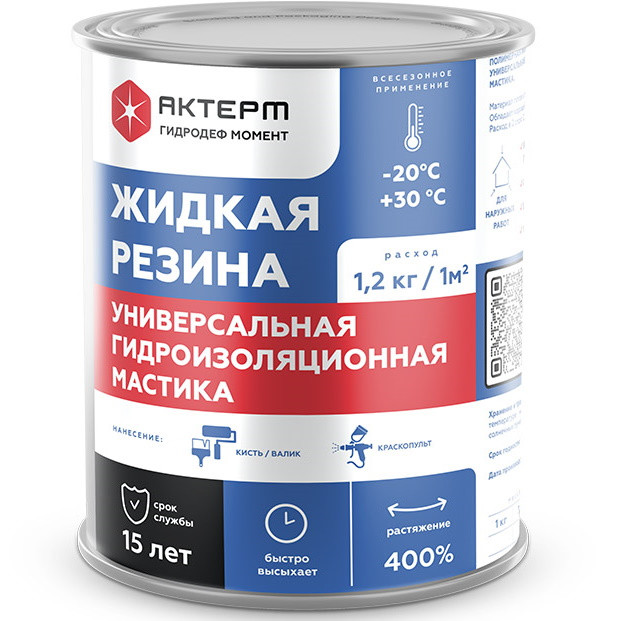 Мастика гидроизоляционная Актерм Жидкая резина ГидроДеф Момент - это смесь стирол-этилен-бутадиен-стирольного и акрилового полимера, применяется для круглогодичной гидроизоляции: кровли, фундаментов, балконов, терасс, мостов и т.д.