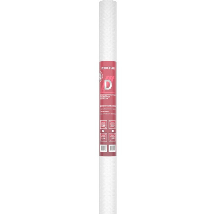 Мембрана гидро-пароизоляционная Изоспан D 1,6х21,88 м — представляет собой двухслойный материал, выполненный из высокопрочного полипропиленового тканого полотна и полипропиленовой плёнки. Материал обладает высоким сопротивлением паропроницанию, водоупорностью и повышенной прочностью, что позволяет применять его в качестве: