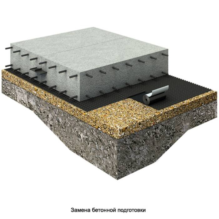 - Замена бетонной подготовки, что позволяет избежать затрат времени на изготовление бетонной подготовки, снижает трудоемкость и стоимость работ, защищает фундаментную плиту от напора воды снизу.