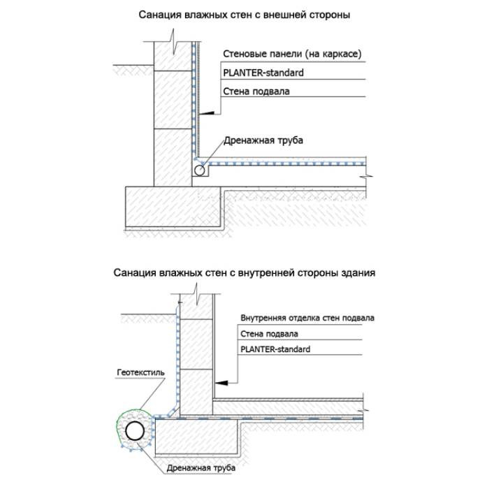 - Санация влажных стен с внутренней стороны, что изолирует подвальное помещение от влажной стены, обеспечивает оптимальный температурно-влажностный режим помещения и удаление скапливающейся влаги со стен во внутренний дренаж.