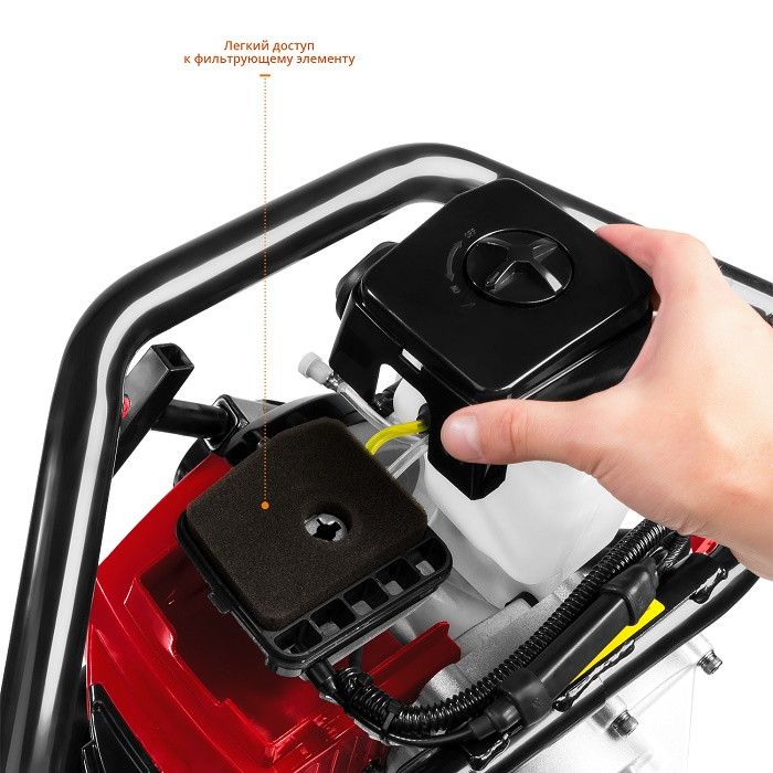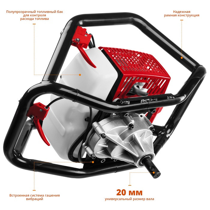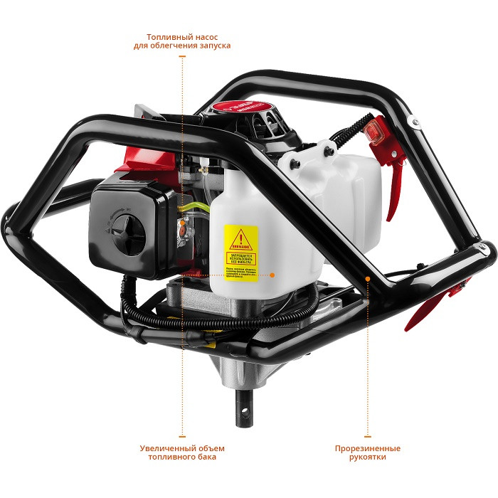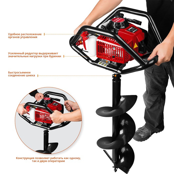 Для удобного управления рабочим процессом все органы управления расположены на одной рукоятке. Конструкция рукоятки позволяет работать как одному оператору, так и двум одновременно, что повышает эффективность бурения и обеспечивает дополнительную сохранность двигателя при работе.