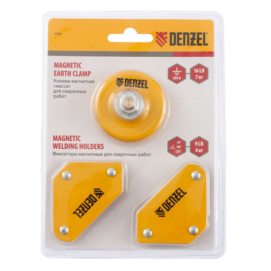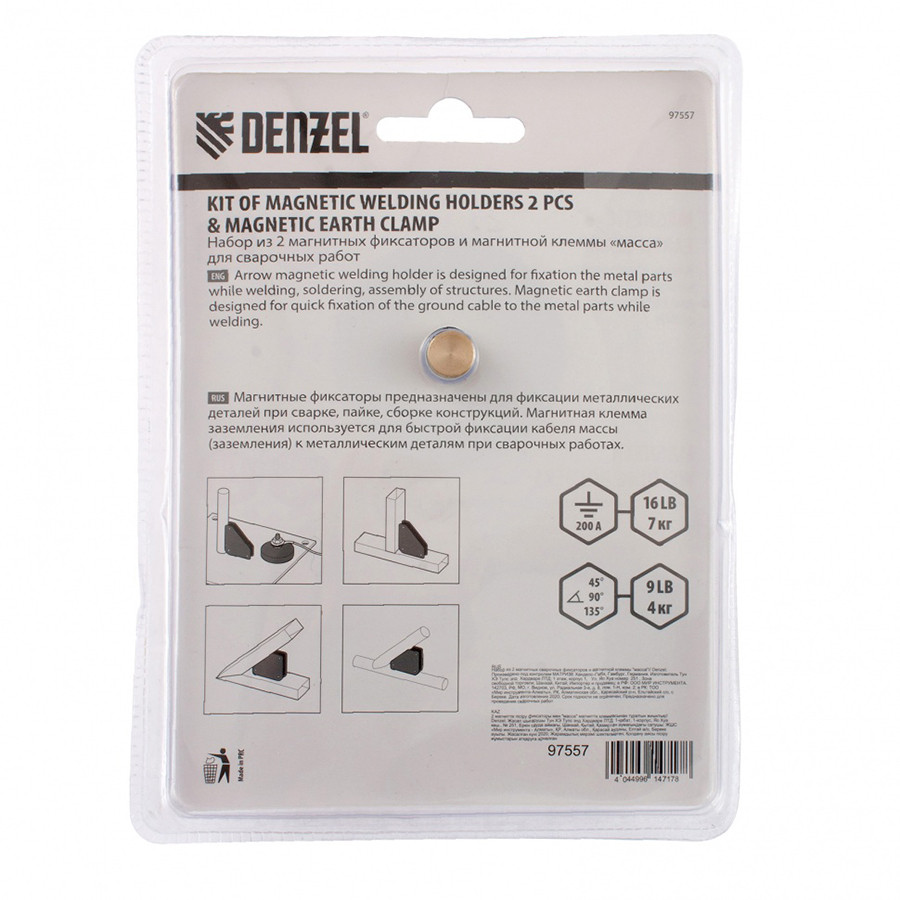 Набор для сварки Denzel 97557 - из 2 универсальных уголков и магнитной клеммы предназначен для проведения сварочных работ. Клемма «масса» с максимальным током 200 А обеспечивает электрическое соединение кабеля заземления и обрабатываемой детали, без которого невозможна ручная дуговая сварка. А магнитные уголки фиксируют свариваемые детали весом до 4 кг в нужном положении, благодаря чему мастер может работать в одиночку.