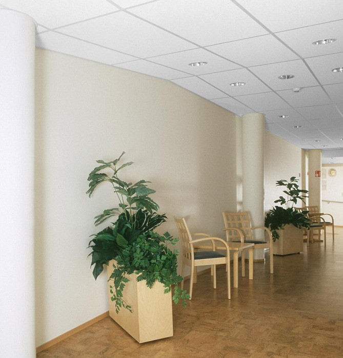 Потолок Ecophon Advantage A является наиболее удобным вариантом в том случае, если нужно обеспечить беспрепятственный доступ к коммуникациям. Благодаря легко снимающимся панелям, смонтированным на основе открытой подвесной системы, присутствует возможность осуществлять быстрый демонтаж элементов.