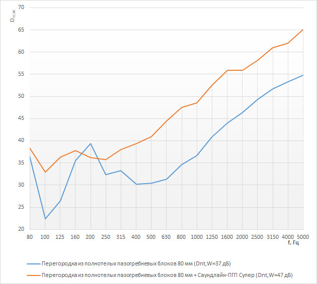 Тонкие перегородки из пазогребневых гипсовых плит или газобетона толщиной 80-100 мм имеют характерное резонансное снижение (отсутствие роста) звукоизоляции в крайне важном для изоляции шума диапазоне частот 200-600 Гц. Панели Саундлайн-ПГП Супер толщиной 23 мм, смонтированные с одной из сторон перегородки, снижают резонансное прохождение звука в данном частотном диапазоне. За счёт этого общая звукоизоляция системы "перегородка+Саундлайн-ПГП Супер" возрастает на величину от 6 до 10 дБ.