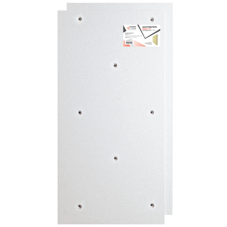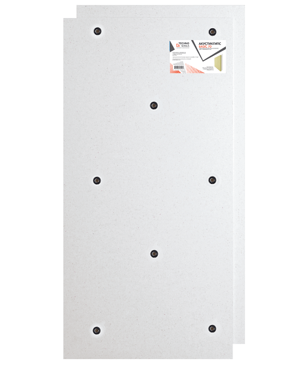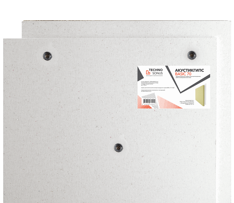 Панель AcousticGyps Basic 70 состоит из жесткого слоя — гипсоволокнистой плиты (ГВЛ) 20 мм (с фальцевым смещением для стыковки), и мягкого слоя — базальтовой плиты 50 мм плотностью 45 кг/м2. В каждой сэндвич-панели предусмотрено восемь заводских отверстий для специальных креплений, исключающих передачу звука.