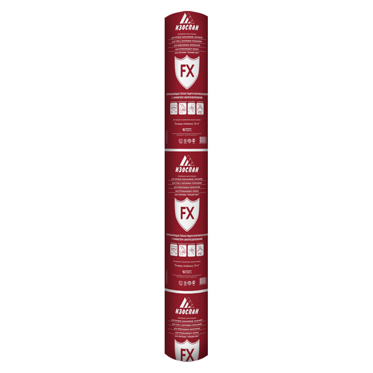Изоспан FX представляет собой материал из вспененного полиэтилена, дублированного металлизированной лавсановой плёнкой. Пенополиэтилен выполняет функцию дополнительной теплоизоляции благодаря своей структуре из изолированных пузырьков воздуха. Металлизированная поверхность материала способна отражать тепловое излучение, а сам материал Изоспан FХ обладает высоким сопротивлением паропроницанию, водоупорностью и необходимой прочностью, что позволяет применять его в качестве: