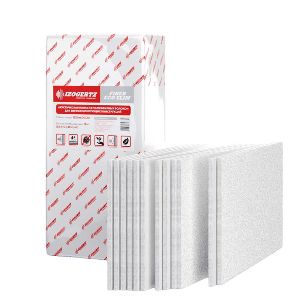 Izogertz Fiber Eco Slim – это звукопоглощающая синтетическая плита, состоящая из полиэфирных волокон, отличительной особенностью которой является экологичность и высокие звукоизоляционные свойства. Волокна плит скрепляются между собой термическим способом, что позволяет избежать фенолформальдегидных примесей, клея и других вредных веществ. Используется в звукоизолирующих каркасных конструкциях стен и потолков в качестве среднего слоя. Плиты Izogertz Fiber Eco Slim отличает стойкость к деформациям, механическим нагрузкам, высокая прочность. Материал сохраняет свои свойства на протяжении всего срока эксплуатации, а также обладает хорошими теплоизоляционными характеристиками. Izogertz Fiber Eco Slim выпускается в модификациях различной плотности, что удобно при выборе наиболее подходящего варианта для звукоизоляционной системы. Материал удобен в работе: не выделяет вредных веществ, колючей пыли, не осыпается. Плиты режутся ножом, легко монтируются.