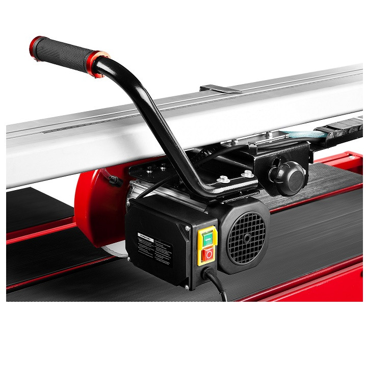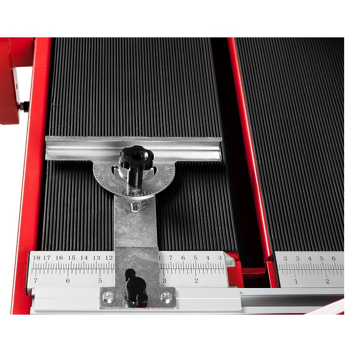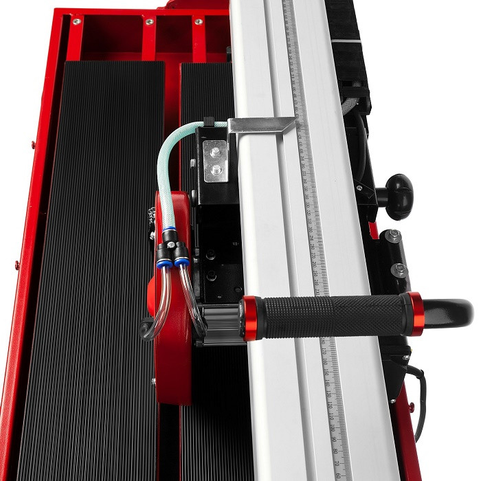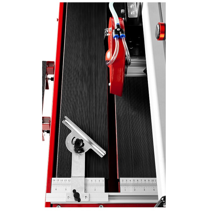Прорезиненая поверхность стола предотвращает соскальзывание плитки во время работы. Дополнительный стол облегчает работу с габаритными деталями. Благодаря фиксирующему упору со шкалой возможна точная установка разрезаемой плитки.